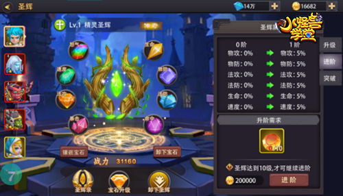 2.圣辉可进行宝石镶嵌、升级、进阶提升属性,宝石可通过吞噬低级宝石升级;